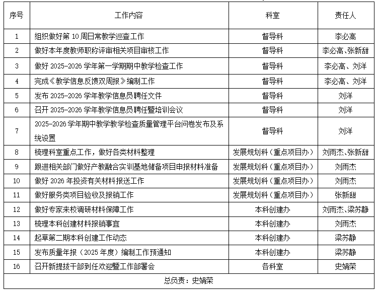 下一条:发展规划与教学质量管理处2025-2026学年第一学期第10周工作计划表(11月10日-11月14日)