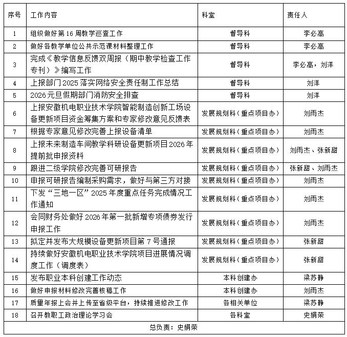 上一条:发展规划与教学质量管理处2025-2026学年第一学期第17周工作计划表(12月29日-1月2日)