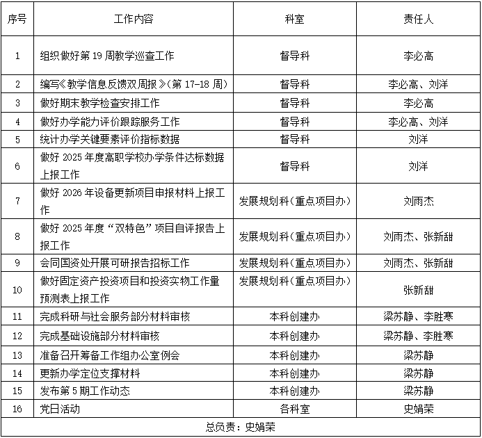上一条:发展规划与教学质量管理处2025-2026学年第一学期第20周工作计划表(1月19日-1月23日)